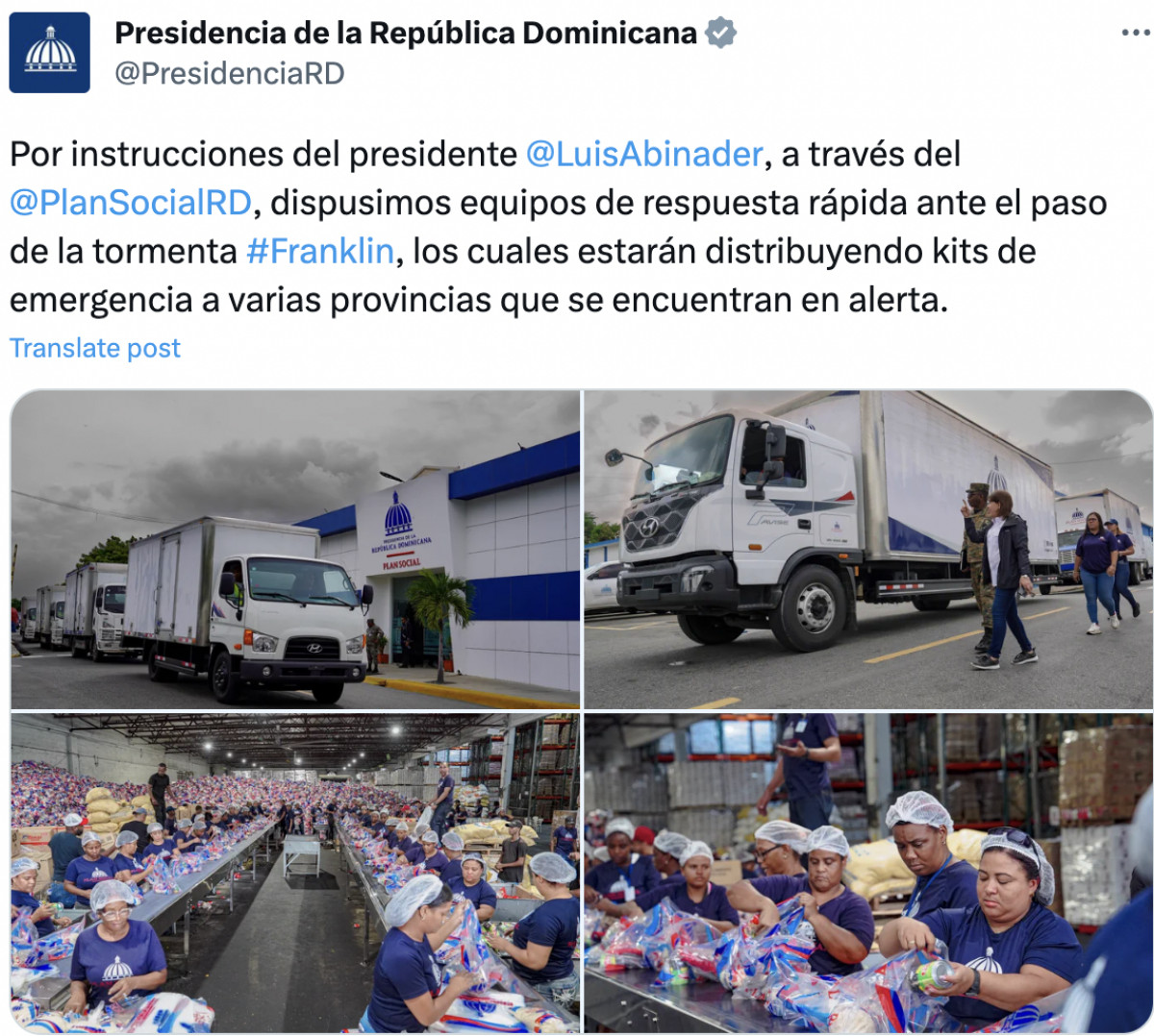 Tras la llegada de la tormenta tropical Franklin a República Dominicana, el Gobierno está implementando programas de asistencia destinados a aquellos más perjudicados por las intensas lluvias e inundaciones.