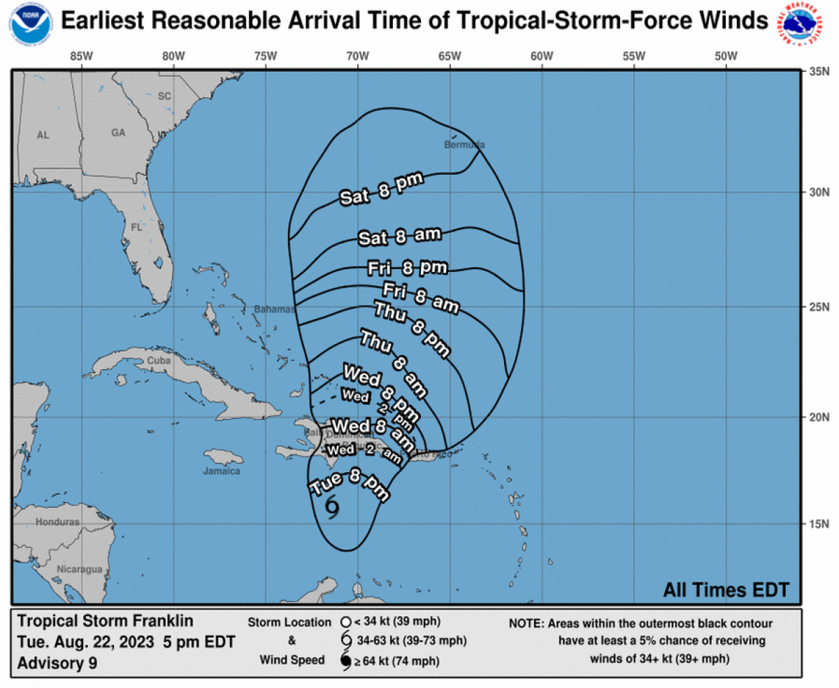 Por su parte, las autoridades de Haití y República Dominicana advirtieron a sus ciudadanos que se preparen para la llegada de la tormenta Franklin. Las islas Turcas y Caicos también estarían siendo vigiladas.