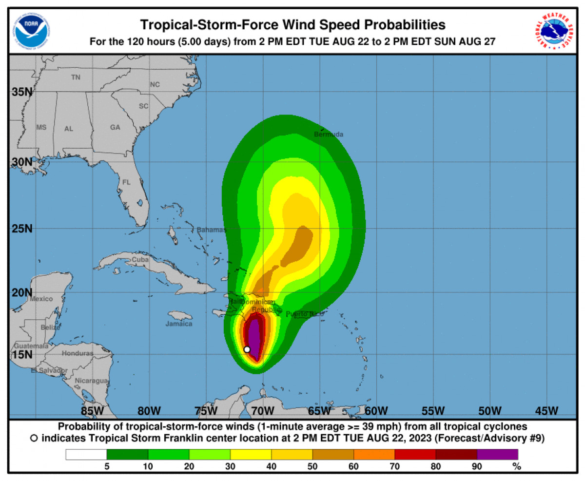 Según el boletín de las 5:00 p.m. de este martes del NHC, la tormenta se encontraba a 210 millas al sur-suroeste de Santo Domingo, capital de la República Dominicana, con vientos de 40 mph. Franklin llegaría el miércoles y podría fortalecerse un poco más en su avance por aguas del Atlántico.