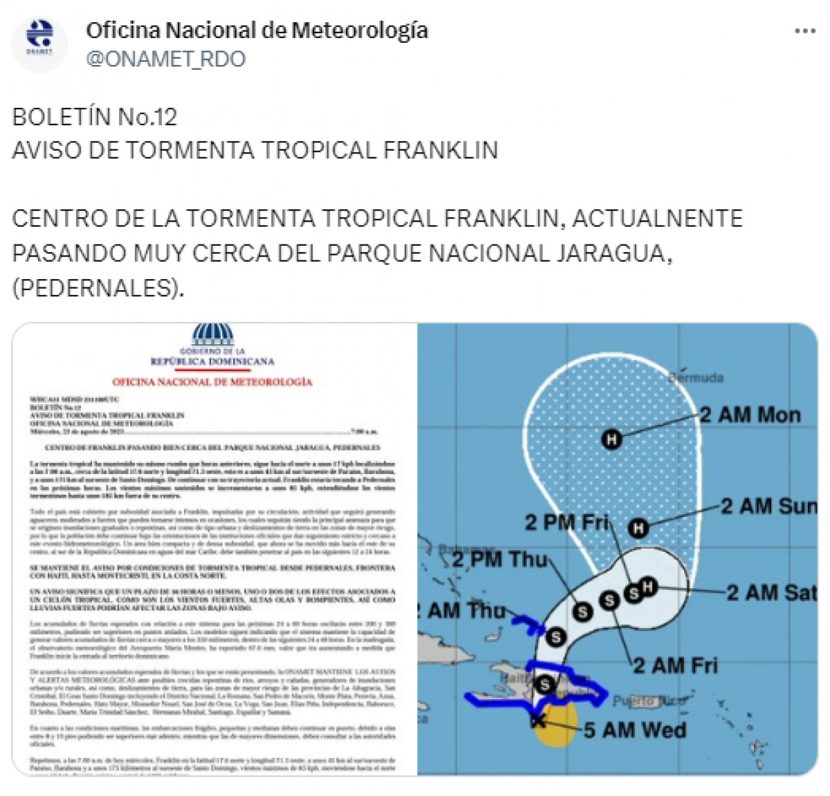 De acuerdo a la información difundida por el medio Noticias Telemicro respecto a lo mencionado por el predictor de la Oficina Nacional de Meteorología, Julio Ordoñez, la tormenta Franklin entraría a República Dominicana entre las 5 y 8 de la mañana de hoy miércoles 23 de agosto ( 6 y 9 a.m. hora peruana).