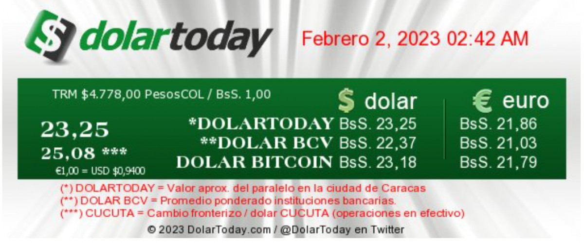 El portal DolarToday estableció a 23,50 bolívares cada dólar para hoy, jueves 2 de febrero.
