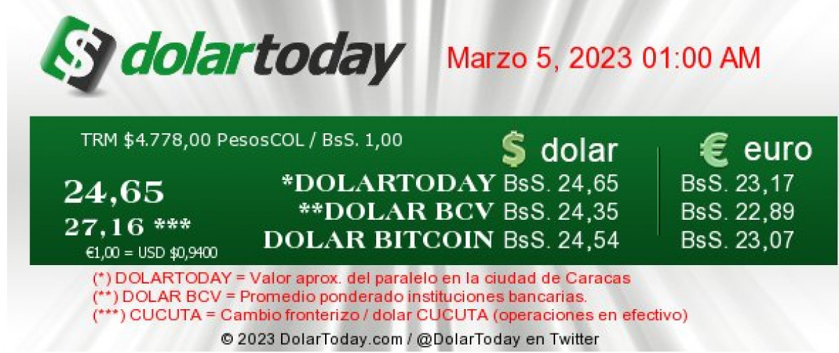 El portal DolarToday estableció a 24,65 bolívares cada dólar para hoy, domingo 5 de marzo de 2023.