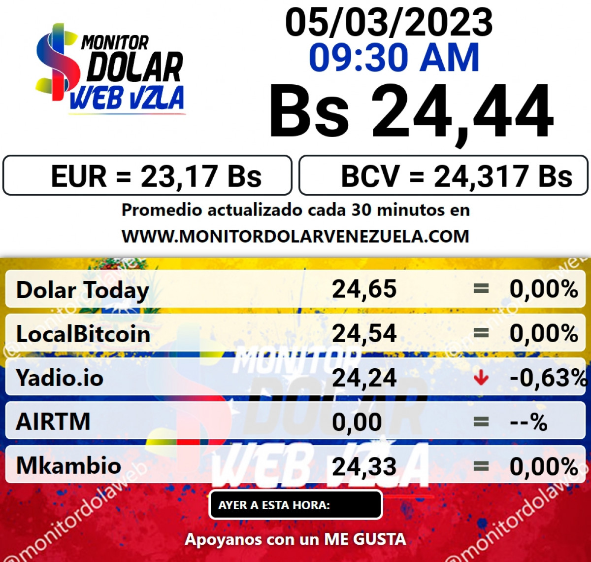 BCV: Bs. 24,31 | Monitor Dolar: Bs. 24,44 | DolarToday: Bs. 24,65 | Yummy Dolar: Bs. 24,32 | @EnParaleloVzla: Bs. 24,64