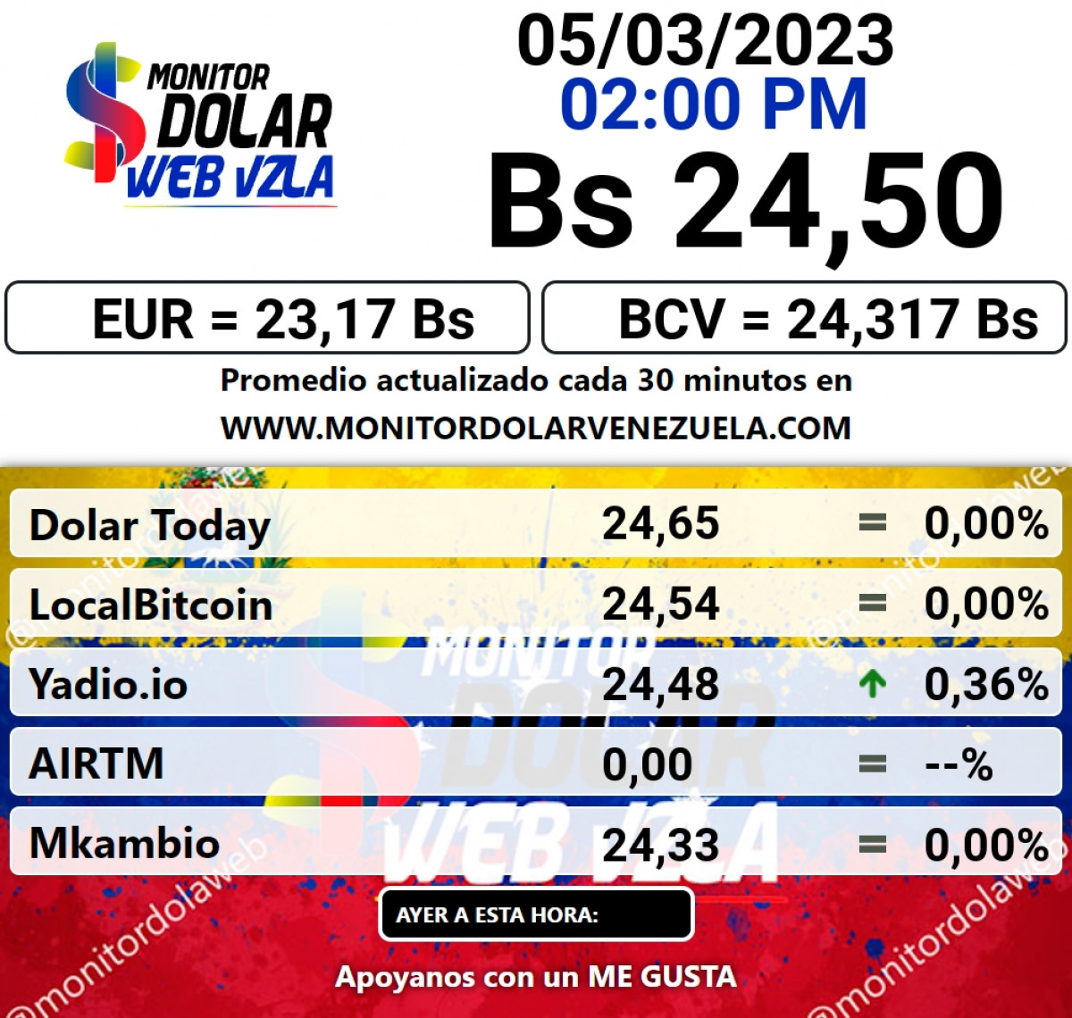 BCV: Bs. 24,31 | Monitor Dolar: Bs. 24,47 | DolarToday: Bs. 24,65 | Yummy Dolar: Bs. 24,32 | @EnParaleloVzla: Bs. 24,64