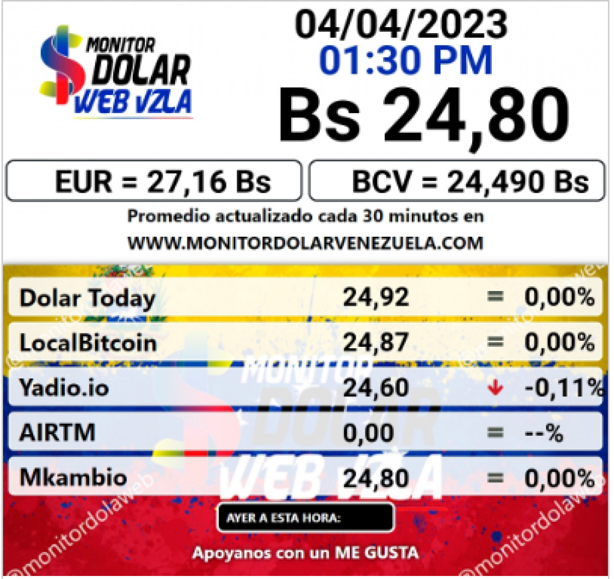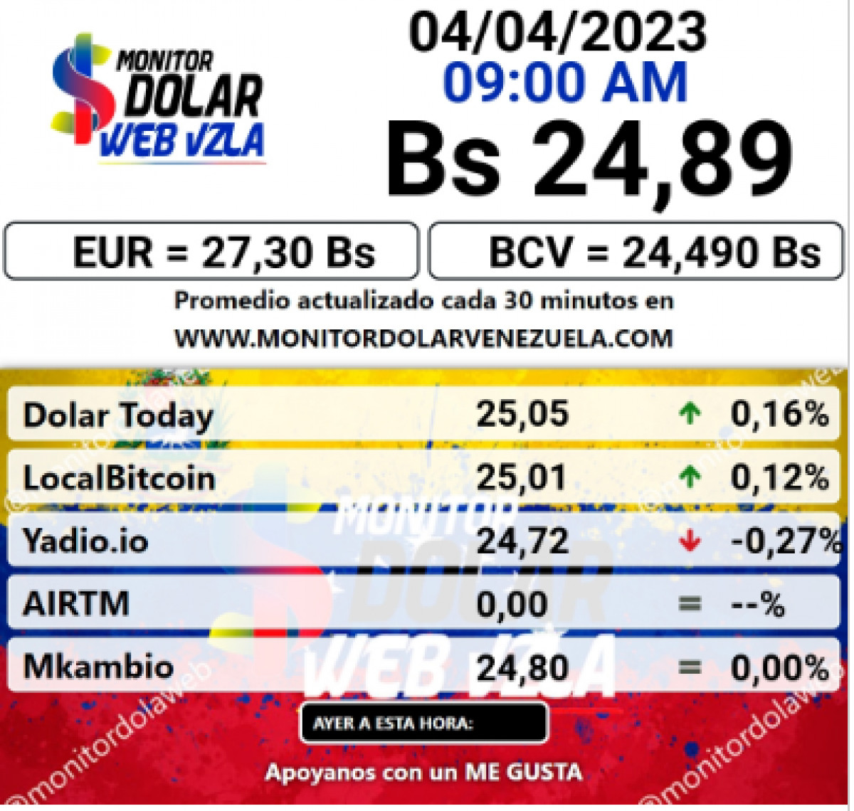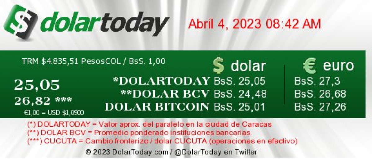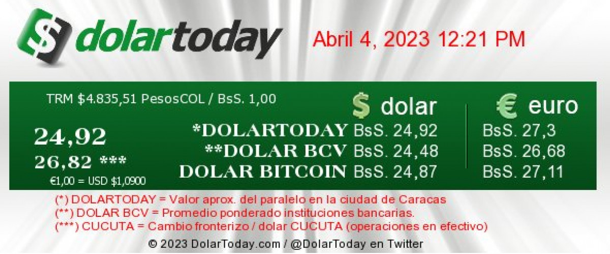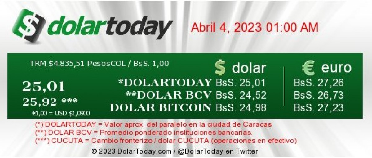 El portal web oficial de DolarToday actualizó el precio del dólar en Venezuela a 24,92 bolívares, mientras tanto, Monitor Dólar cotizó en 24,80 el precio de la divisa estadounidense para HOY, martes 4 de abril. Por su parte, el dólar BCV estableció en 24,48 en su último reporte oficial. La diferencia en la tasa del dólar se debe al mercado negro de las casas de cambio que existen en el país, las mismas que el Estado no fiscaliza ni interviene. Este tipo de cambio suele encontrarse muy por encima del dólar oficial.