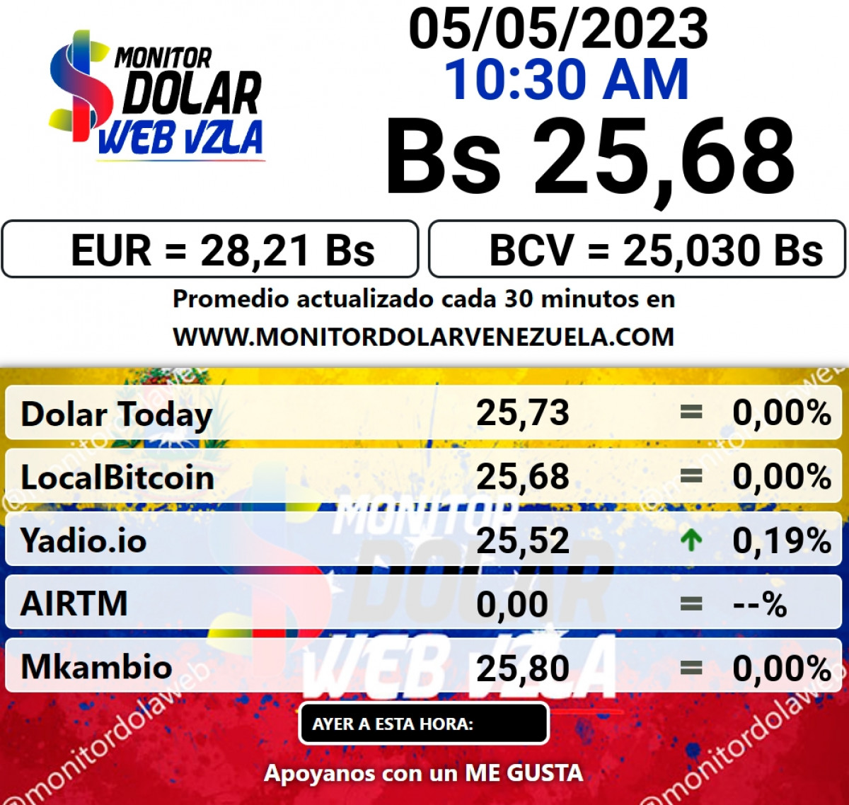 El portal web oficial de Monitor Dolar actualizó el precio de la divisa norteamericana en 25,68 bolívares para hoy, 5 de mayo.