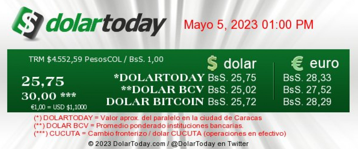 El portal DolarToday estableció a 25,75 bolívares cada dólar para hoy, viernes 5 de mayo de 2023.