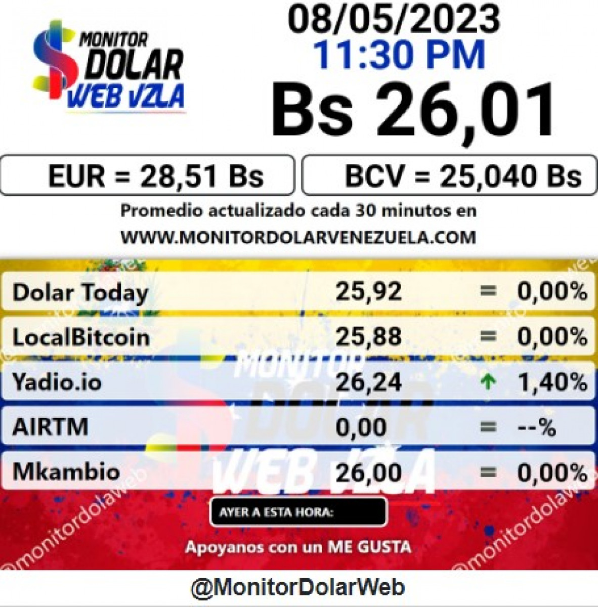 El portal web oficial de Monitor Dolar actualizó el precio de la divisa norteamericana en 26,01 para hoy, lunes 8 de mayo de 2023 en Venezuela.