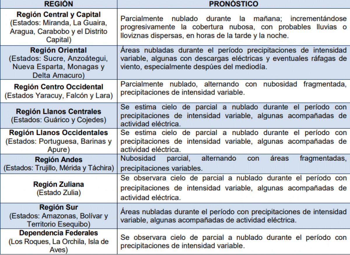 ¿Cuál es el último pronóstico del Inameh para Venezuela hoy?