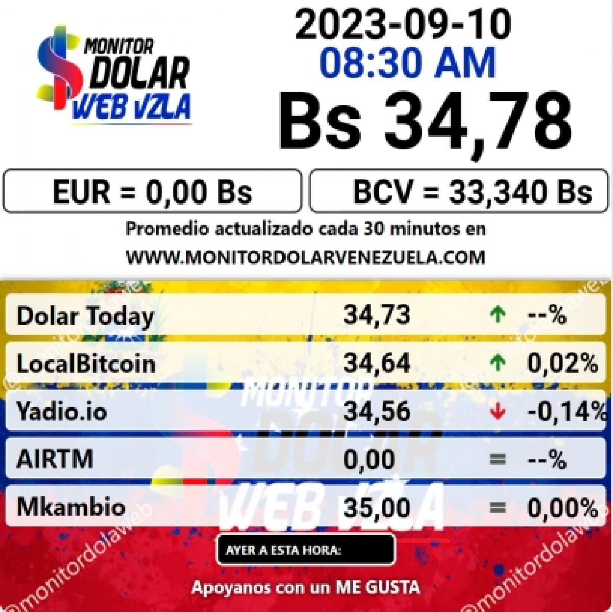 DolarToday fijó en 34,95 bolívares el precio de la divisa estadounidense en Venezuela, mientras que Monitor Dólar actualizó en Bs. 34,81 el promedio para HOY, domingo 10 de septiembre. El valor oficial del dólar BCV fue establecido en Bs. 33,34 según el último reporte oficial. La diferencia en la tasa del dólar se debe al mercado negro de las casas de cambio que existen en el país, las mismas que el Estado no fiscaliza ni interviene. Este tipo de cambio suele encontrarse muy por encima del dólar oficial.