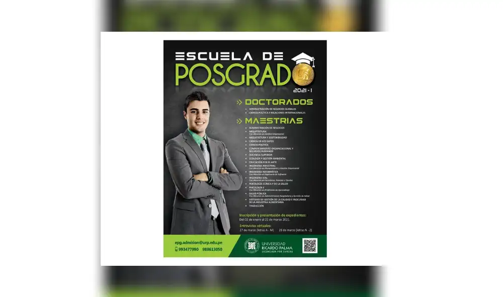 Si deseas ser parte de la Escuela de Posgrado de la URP, puedes inscribirte y presentar tus expedientes hasta el 21 de marzo. Asimismo, puedes comunicarte con ellos a través del correo epg.admision@urp.edu.pe o contactarlos al 993 477 990.