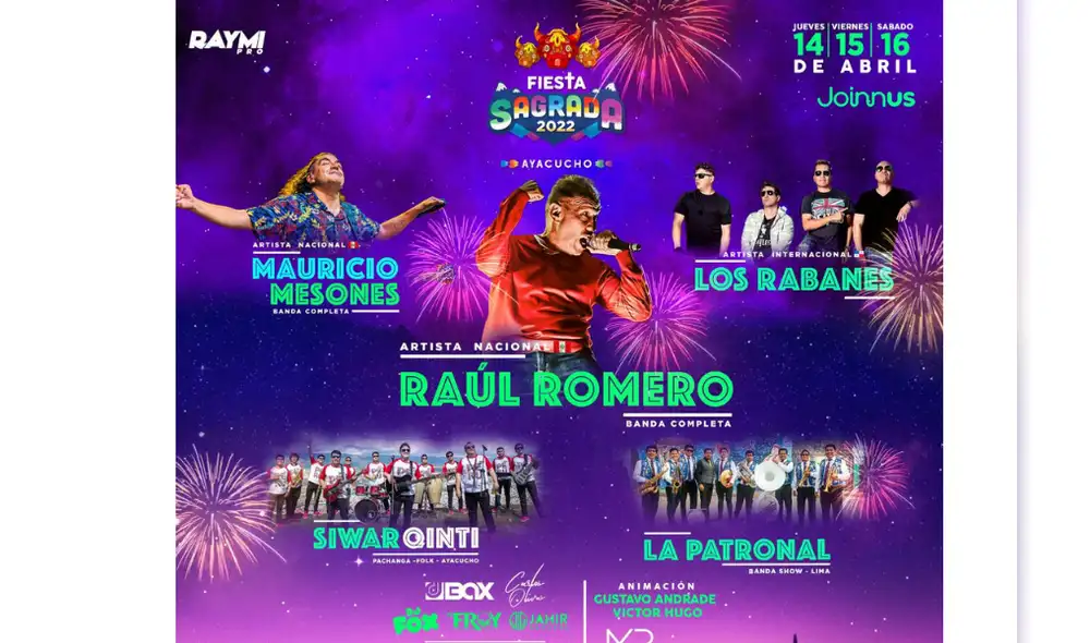 Este año para su reencuentro con su público Fiesta Sagrada, calificado por muchos como el mejor festival de semana santa en Ayacucho, ofrece una cartelera de artistas nacionales e internacionales que llegaran a la ciudad de las 33 iglesias. Los artistas nacionales son encabezados por Raúl Romero, quien regresa a la capital ayacuchana después de años junto al renombrado artista nacional Mauricio Mesones y su banda completa.