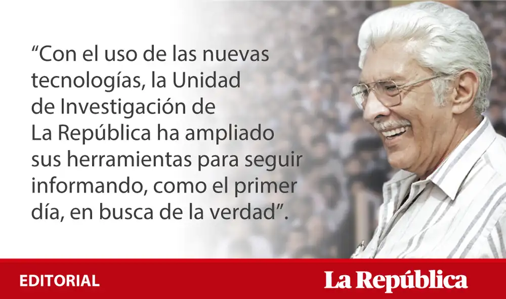 Con el uso de las nuevas tecnologías, la Unidad de Investigación de La República ha ampliado sus herramientas para seguir informando, como el primer día, en busca de la verdad. En tiempos de fake news, posverdad y desinformación, solo el compromiso del periodismo serio e independiente podrá garantizarnos la calidad de la información en temas de interés público. Larga vida a la Unidad de Investigación.
