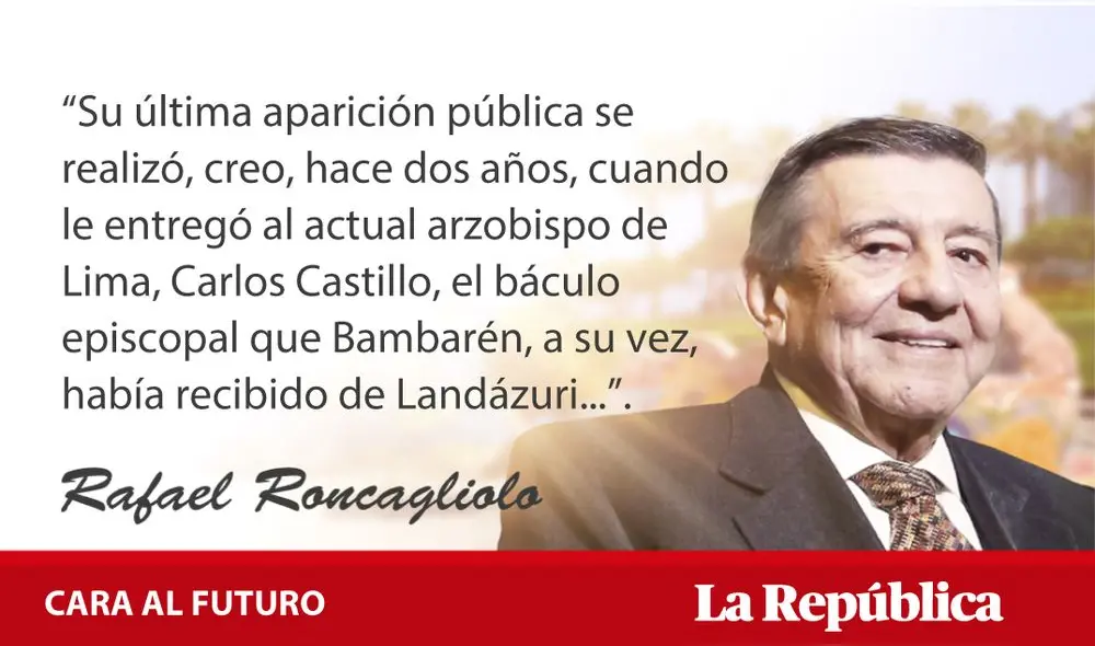 “Su última aparición pública se realizó, creo, hace dos años, cuando le entregó al actual arzobispo de Lima, Carlos Castillo, el báculo episcopal que Bambarén, a su vez, había recibido de Landázuri...”.