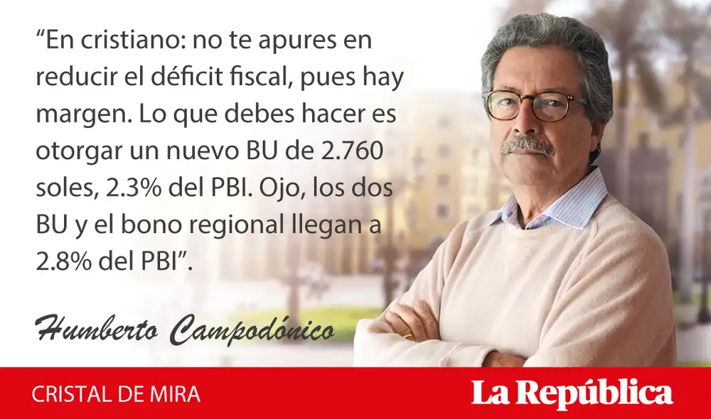 “En cristiano: no te apures en reducir el déficit fiscal, pues hay margen. Lo que debes hacer es otorgar un nuevo BU de 2,760 soles, 2.3% del PBI. Ojo, los dos BU y el bono regional llegan a 2.8% del PBI”.