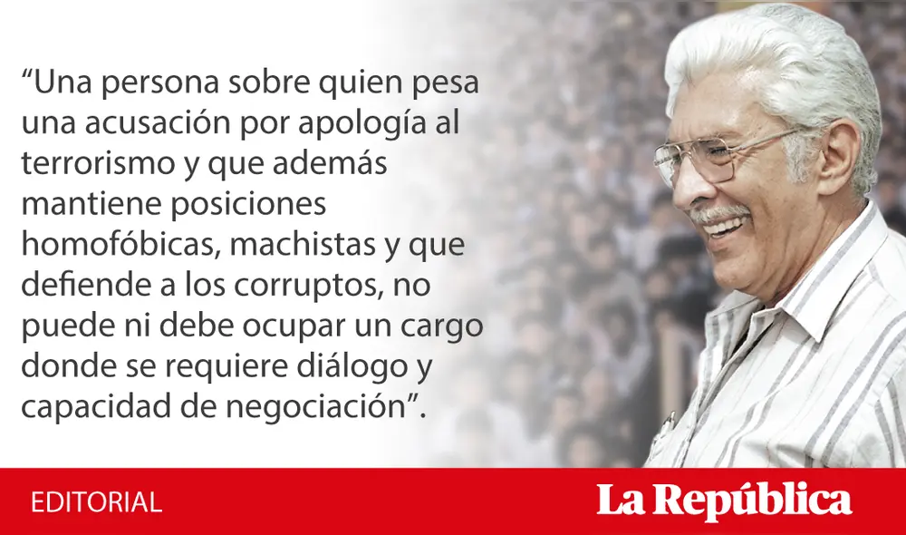 El anuncio de colocar al congresista Bellido en una posición de tanta importancia es sin duda la ruptura del compromiso básico de mantener al país lejos de cualquier amenaza extremista. Una persona sobre quien pesa una acusación por apología al terrorismo y que además mantiene posiciones homofóbicas, machistas y que defiende a los corruptos no puede ni debe ocupar un cargo donde se requiere diálogo y capacidad de negociación.