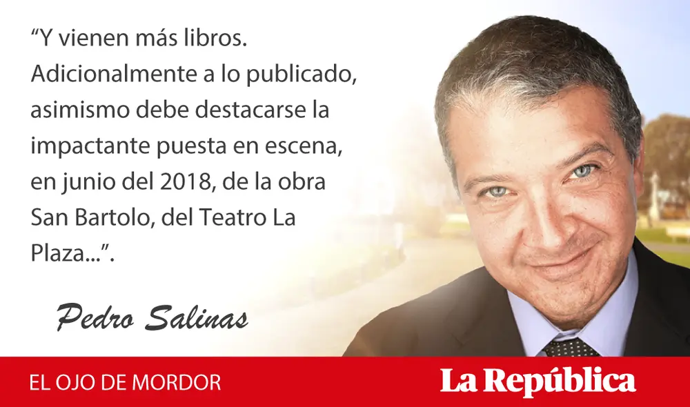 “Y vienen más libros. Adicionalmente a lo publicado, asimismo debe destacarse la impactante puesta en escena, en junio del 2018, de la obra San Bartolo, del Teatro La Plaza...”.