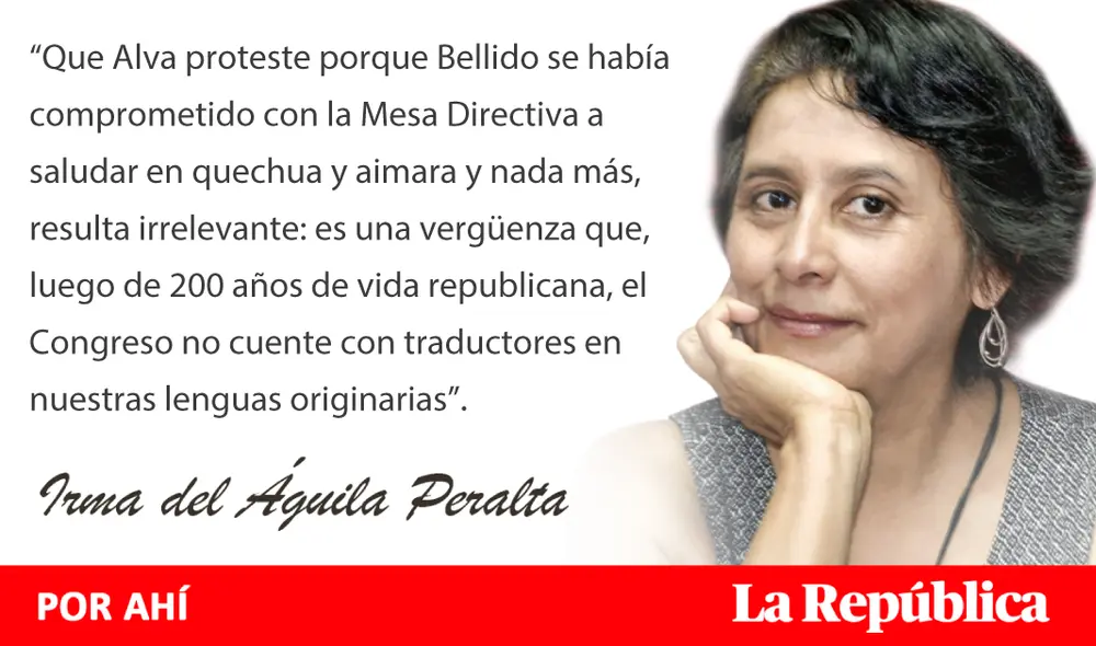 “Que Alva proteste porque Bellido se había comprometido con la Mesa Directiva a saludar en quechua y aimara y nada más, resulta irrelevante: es una vergüenza que, luego de 200 años de vida republicana, el Congreso no cuente con traductores en nuestras lenguas originarias”.