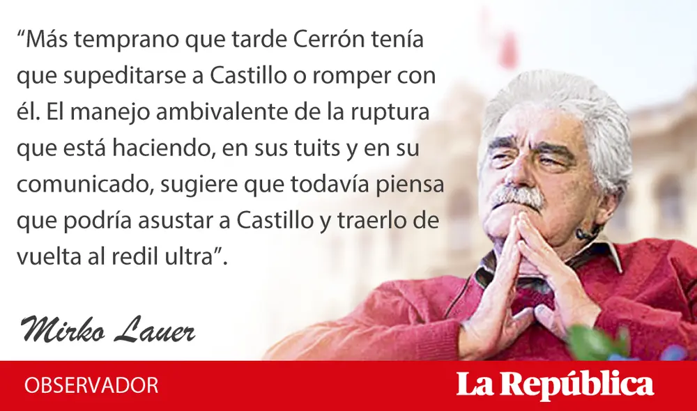 “Más temprano que tarde Cerrón tenía que supeditarse a Castillo o romper con él. El manejo ambivalente de la ruptura que está haciendo, en sus tuits y en su comunicado, sugiere que todavía piensa que podría asustar a Castillo y traerlo de vuelta al redil ultra”.