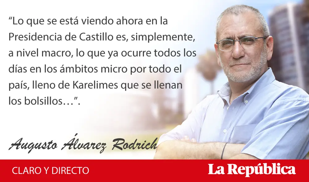 Si eso es así, lo que se está viendo ahora en la presidencia de Castillo es, simplemente, a nivel macro, lo que ya ocurre todos los días en los ámbitos micro por todo el país, lleno de Karelimes que se llenan los bolsillos, deciden lo que hacen muchas autoridades, y las entretienen a ellas y a sus familiares.