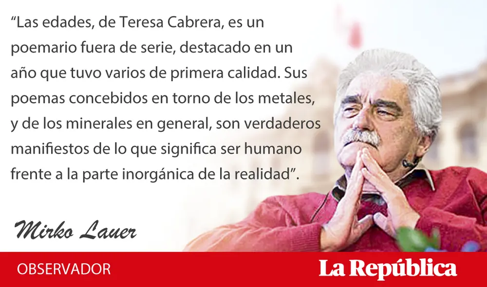 “Las edades, de Teresa Cabrera, es un poemario fuera de serie, destacado en un año que tuvo varios de primera calidad. Sus poemas concebidos en torno de los metales, y de los minerales en general, son verdaderos manifiestos de lo que significa ser humano frente a la parte inorgánica de la realidad”.