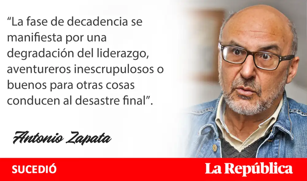 “La fase de decadencia se manifiesta por una degradación del liderazgo, aventureros inescrupulosos o buenos para otras cosas conducen al desastre final”.