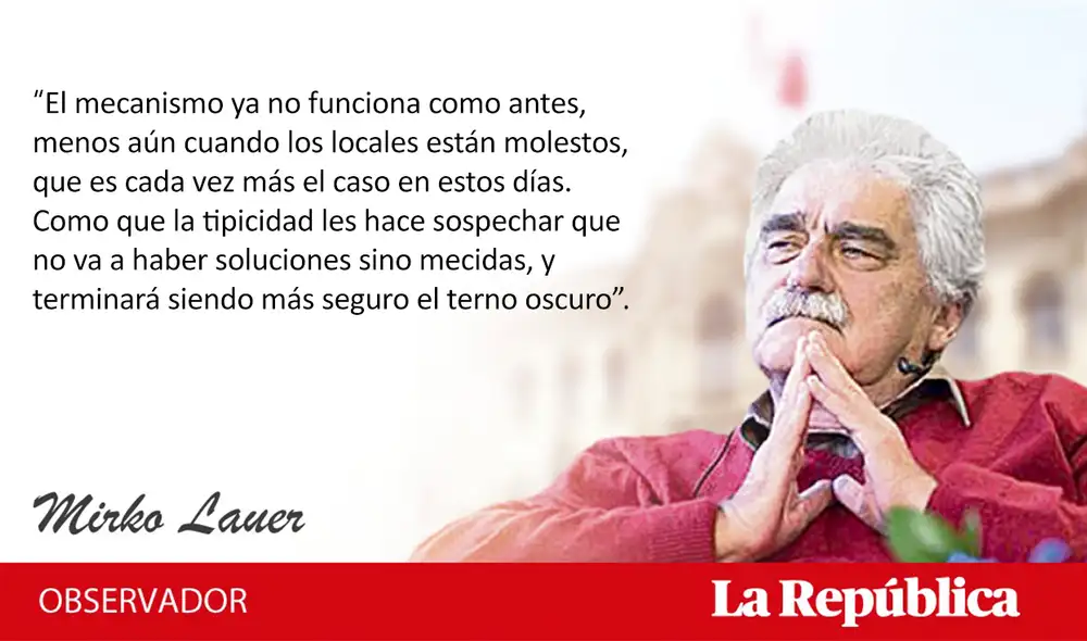 “El mecanismo ya no funciona como antes, menos aún cuando los locales están molestos, que es cada vez más el caso en estos días. Como que la tipicidad les hace sospechar que no va a haber soluciones sino mecidas, y terminara siendo más seguro el terno oscuro”.