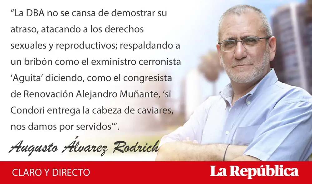 La DBA no se cansa de demostrar su atraso, atacando a los derechos sexuales y reproductivos; respaldando a un bribón como el exministro cerronista ‘Aguita’ diciendo, como el congresista de Renovación Alejandro Muñante, “si Condori entrega la cabeza de caviares, nos damos por servidos”; mintiendo que ‘El Ojo que Llora’ es homenaje al terrorismo; persiguiendo al exministro Daniel Alfaro por unos ‘links porno’ que solo están en sus pervertidas cabecitas; financiando a La Resistencia; y siendo toros furiosos ante cada trapo rojo que se mueva, sin darse cuenta de que ser de izquierda no es ser terrorista.