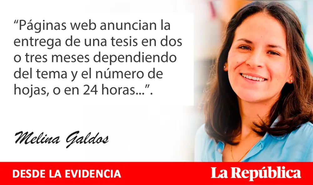 “Páginas web anuncian la entrega de una tesis en dos o tres meses dependiendo del tema y el número de hojas, o en 24 horas...”.