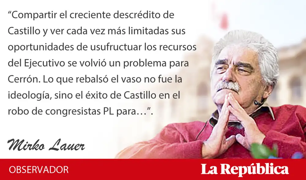 Compartir el creciente descrédito de Castillo y ver cada vez más limitadas sus oportunidades de usufructuar los recursos del Ejecutivo se volvió un problema para Cerrón. Lo que rebalsó el vaso no fue la ideología, sino el éxito de Castillo en el robo de congresistas PL para ir engordando una bancada diferenciada y propia.