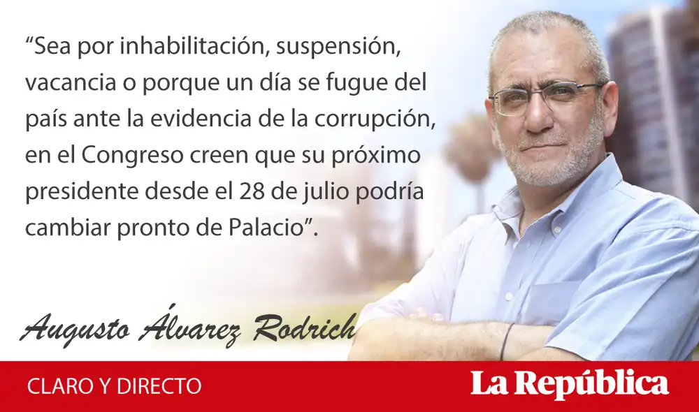 Sea por inhabilitación, suspensión, vacancia o porque un día se fugue del país ante la evidencia de la corrupción, en el Congreso creen que su próximo presidente desde el 28 de julio podría cambiar pronto de palacio, lo cual explica una lid tan aguda en la que hasta ya se están ofreciendo fajines del gabinete ministerial que se instalaría con el nuevo gobierno.