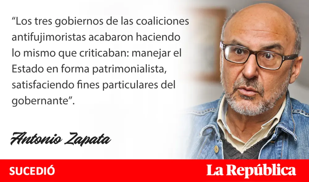 ”Los tres gobiernos de las coaliciones antifujimoristas acabaron haciendo lo mismo que criticaban: manejar el Estado en forma patrimonialista, satisfaciendo fines particulares del gobernante”.