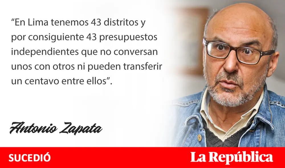 “En Lima tenemos 43 distritos y por consiguiente 43 presupuestos independientes que no conversan unos con otros ni pueden transferir un centavo entre ellos”.