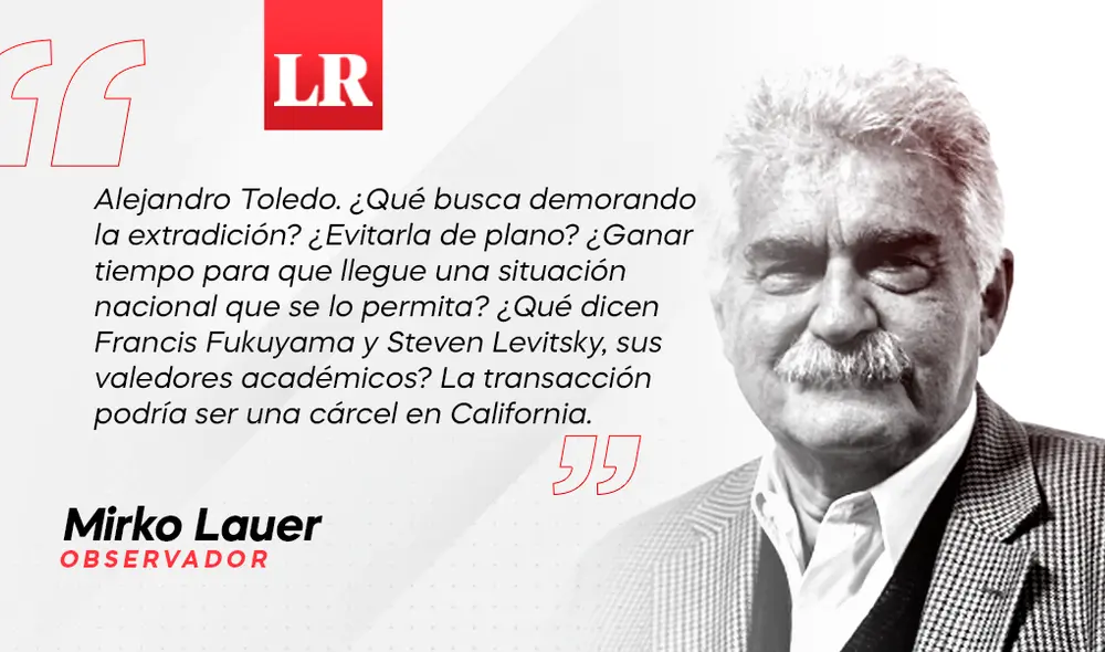 "Alejandro Toledo. ¿Qué busca demorando la extradición? ¿Evitarla de plano? ¿Ganar tiempo para que llegue una situación nacional que se lo permita? ¿Qué dicen Francis Fukuyama y Steven Levitsky, sus valedores académicos? La transacción podría ser una cárcel en California".