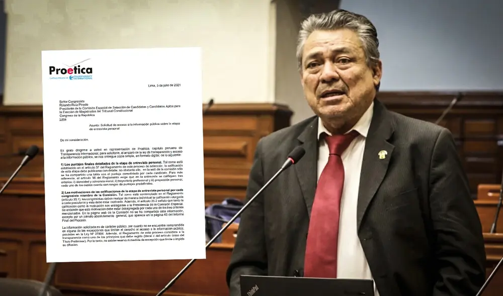 La organización civil Proética remitió este lunes una carta al presidente de la Comisión Especial para la selección de miembros del Tribunal Constitucional (TC), Rolando Ruiz Pinedo, solicitando formalmente la entrega de información detallada sobre la calificación de la etapa de entrevistas a los postulantes de este concurso público.