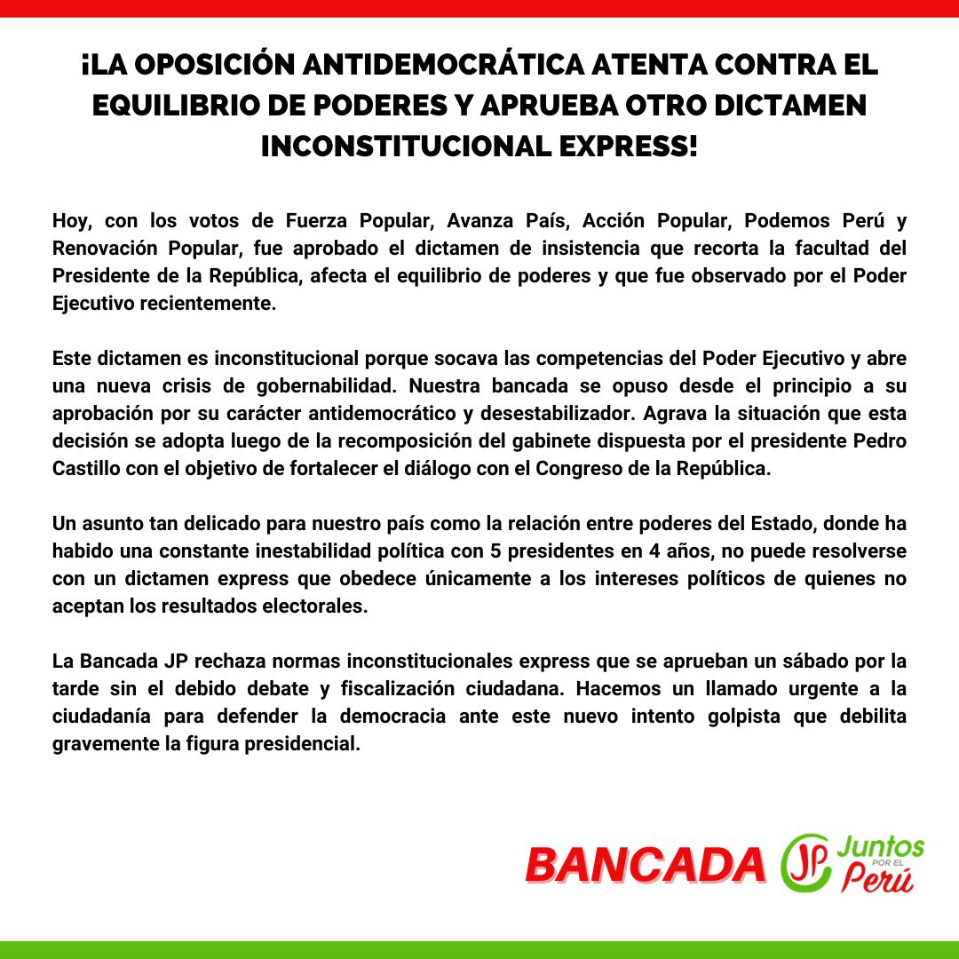 Mediante un pronunciamiento, la bancada de Juntos por el Perú manifestó lo siguiente: "Rechazamos normas inconstitucionales express que recortan las facultades presidenciales, afectan el equilibrio de poderes y no cuentan con el debido debate ni la fiscalización ciudadana. La Bancada JP defenderá la democracia ante este nuevo intento golpista". Foto: @bancadaJP