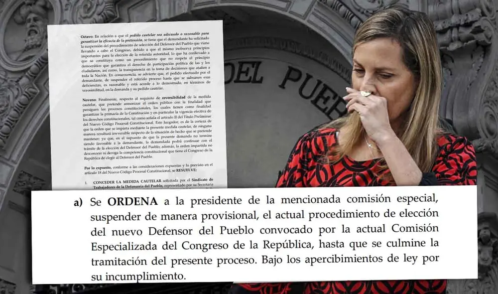 “Se ordena a la presidente de la mencionada comisión especial (María del Carmen Alva) suspender, de manera provisional, el actual procedimiento de elección del nuevo defensor del pueblo convocado por la actual Comisión Especializada del Congreso de la República, hasta que se culmine la tramitación del presente proceso. Bajo los apercibimientos de ley por su incumplimiento”, se lee en la parte resolutiva del documento.