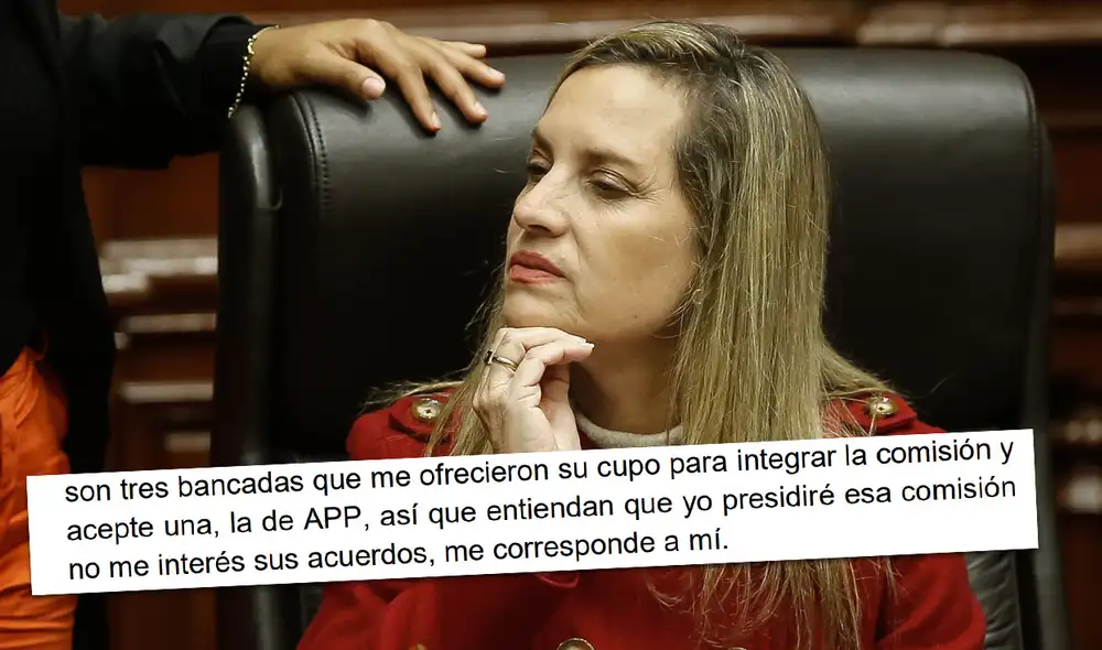 “Hagan lo que ustedes hagan, son tres bancadas que me ofrecieron su cupo para integrar la comisión (de Relaciones Exteriores), y acepté una, la de APP. Así que entiendan que yo presidiré esa comisión, no me interesa sus acuerdos, me corresponde a mí”, insistió la legisladora de Acción Popular.