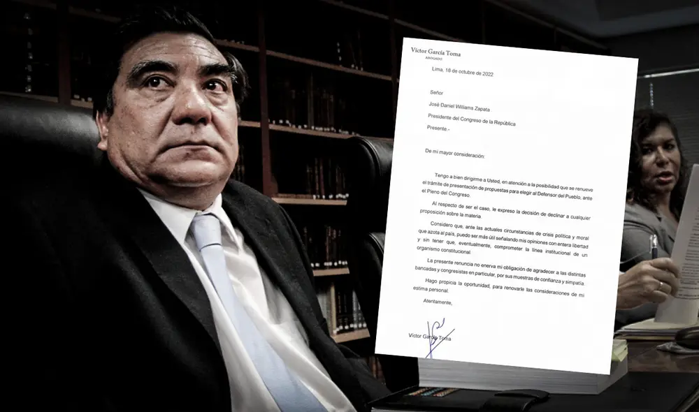 El abogado Víctor García Toma optó por dar un paso al costado a su intención de ocupar el cargo de defensor del pueblo y así lo hizo conocer en una misiva remitida hoy al presidente del Parlamento, José Williams.