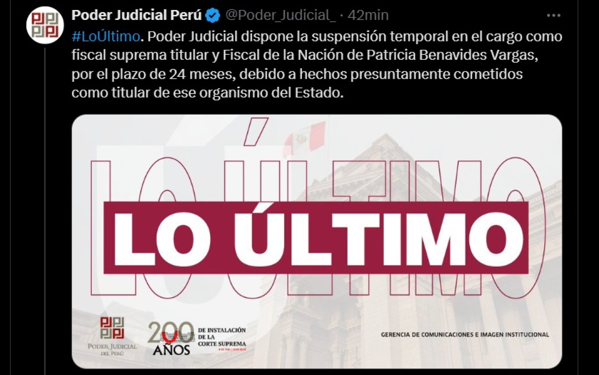 A través de su cuenta de X, el Poder Judicial informó que se dispuso la suspensión temporal en el cargo como fiscal suprema titular y fiscal de la Nación a Patricia Benavides por presuntos delitos cometidos durante su estancia como titular del Ministerio Público.