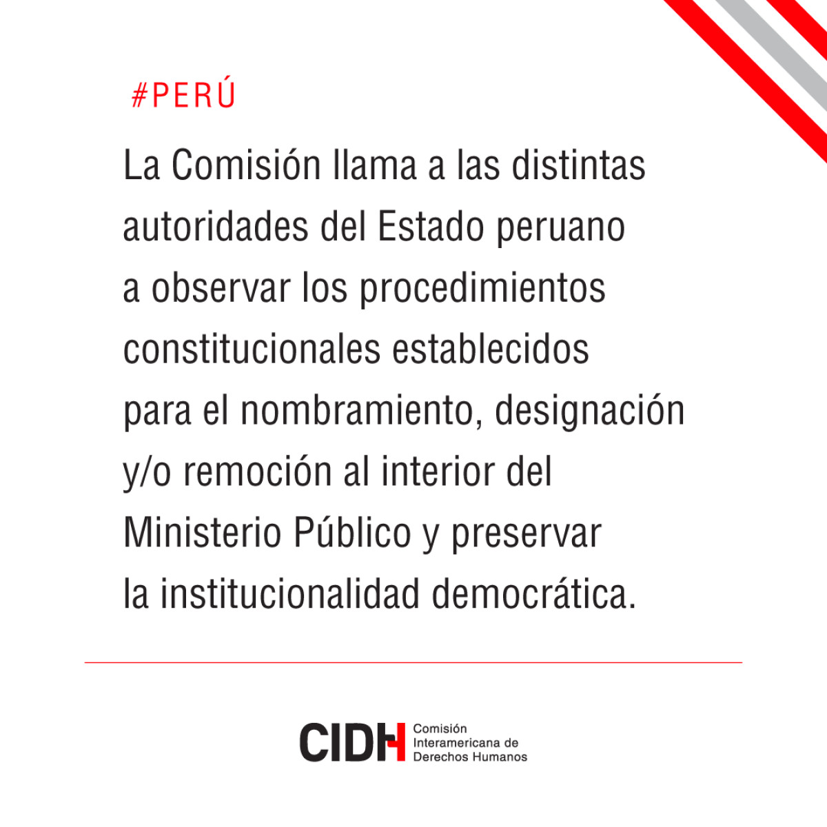 La Comisión Interamericana de Derechos Humanos (CIDH) hizo un llamado a las autoridades a "observar los procedimientos constitucionales" relacionados al reciente intento de la JNJ de reponer en el cargo de fiscal de la Nación a Patricia Benavides.