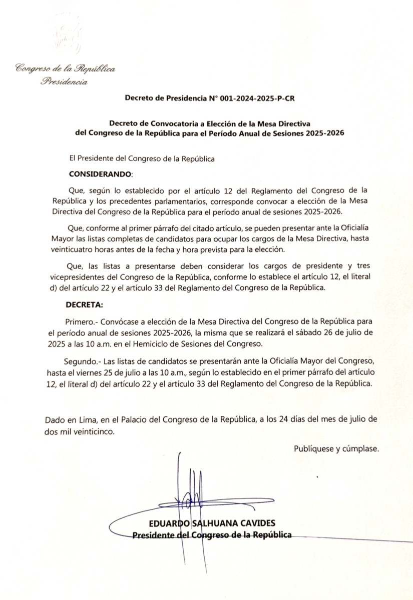 El presidente del Congreso, Eduardo Salhuana, convocó de forma oficial a la elección de la próxima y última Mesa Directiva para este sábado 26 de julio. Hasta el momento, José Jerí es quien presenta mayor apoyo por parte de sus colegas parlamentarios.