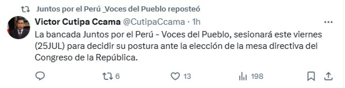 A través de su cuenta de X, el congresista Víctor Citupa anunció que la bancada Juntos por el Perú - Voces del Pueblo se reunirán este viernes para definir su apoyo a uno de los candidatos a la Mesa Directiva.