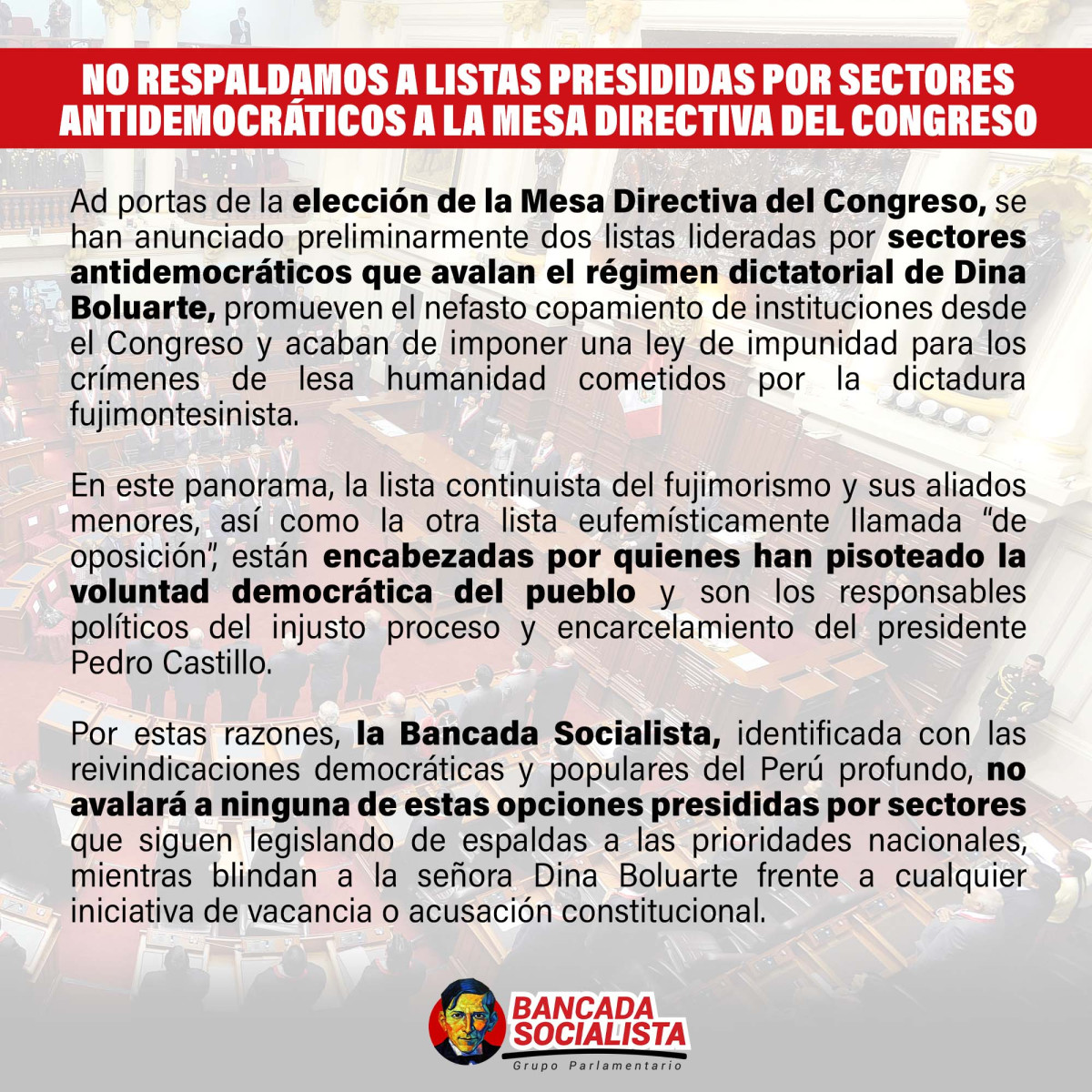 "Se han anunciado preliminarmente dos listas lideradas por sectores antidemocráticos que avalan el régimen dictatorial de Dina Boluarte (...) Por estas razones, la Bancada Socialista no avalará a ninguna de estas opciones presididas"