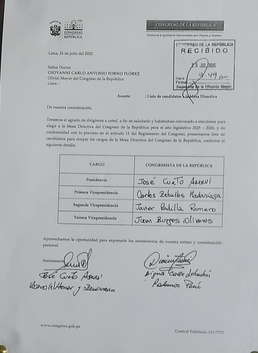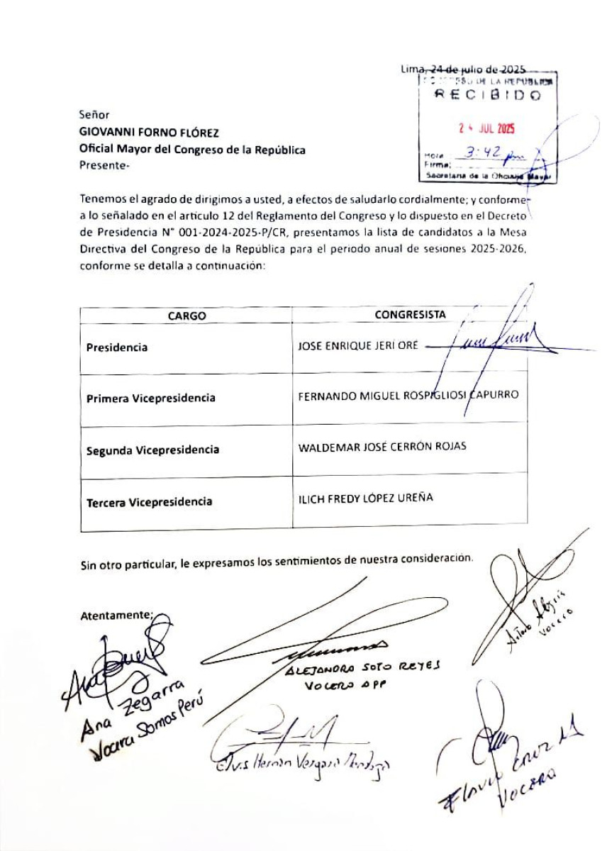 Los congresistas José Jerí y José Cueto presentaron sus listas candidatas a la Mesa Directiva del Congreso para su último año legislativo. Horas antes de cerrar el plazo establecido por la Oficialía Mayor del Parlamento, Cueto presentó su fórmula integrada por los legisladores Carlos Zeballos, Javier Padilla y Juan Burgos. Por su parte, Jerí, quien ha sido denunciado por el presunto delito de violación sexual, es acompañado por los congresistas Fernando Rospigliosi, Waldemar Cerrón e Ilich López. Esta última lista se perfila como la mayor apoyo parlamentario. La votación se llevará a cabo este sábado 26 de julio a las 10 de la mañana en el Palacio Legislativo.