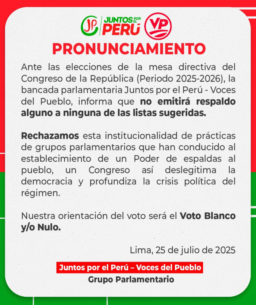 A través de su cuenta en X, la bancada Juntos por el Perú y Voces del Pueblo informó que no apoyarán a las listas candidatas a ser integrantes de la Mesa Directiva del Congreso.