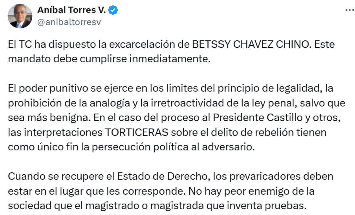 "El TC ha dispuesto la excarcelación de BETSSY CHAVEZ CHINO. Este mandato debe cumplirse inmediatamente. El poder punitivo se ejerce en los limites del principio de legalidad, la prohibición de la analogía y la irretroactividad de la ley penal, salvo que sea más benigna", se lee en su pronunciamiento.