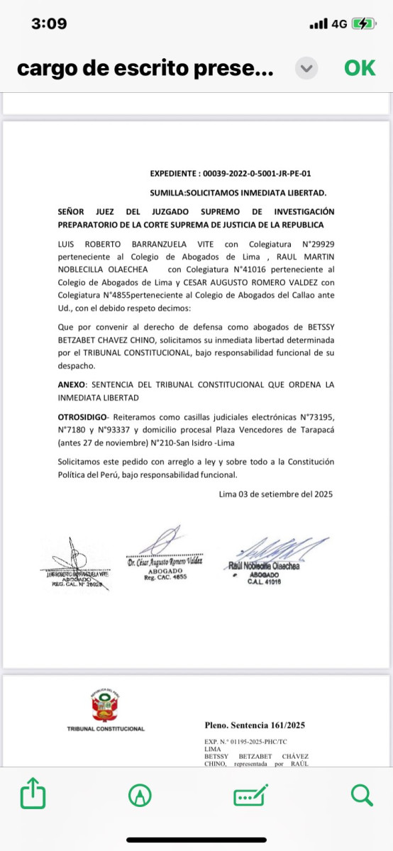 El abogado de Betssy Chávez presentó un escrito ante el Poder Judicial y solicitó que se ejecute de inmediato la sentencia del Tribunal Constitucional que ordena su liberación.
