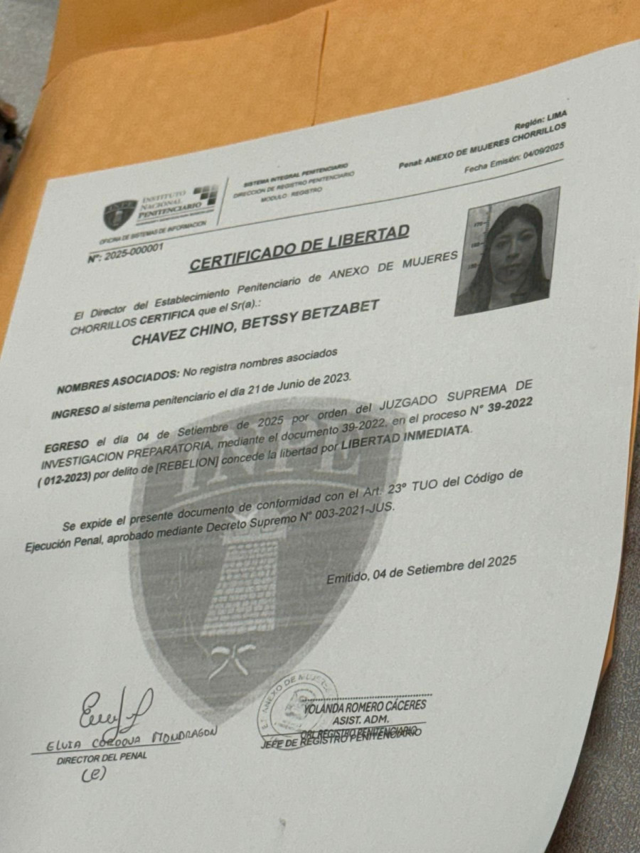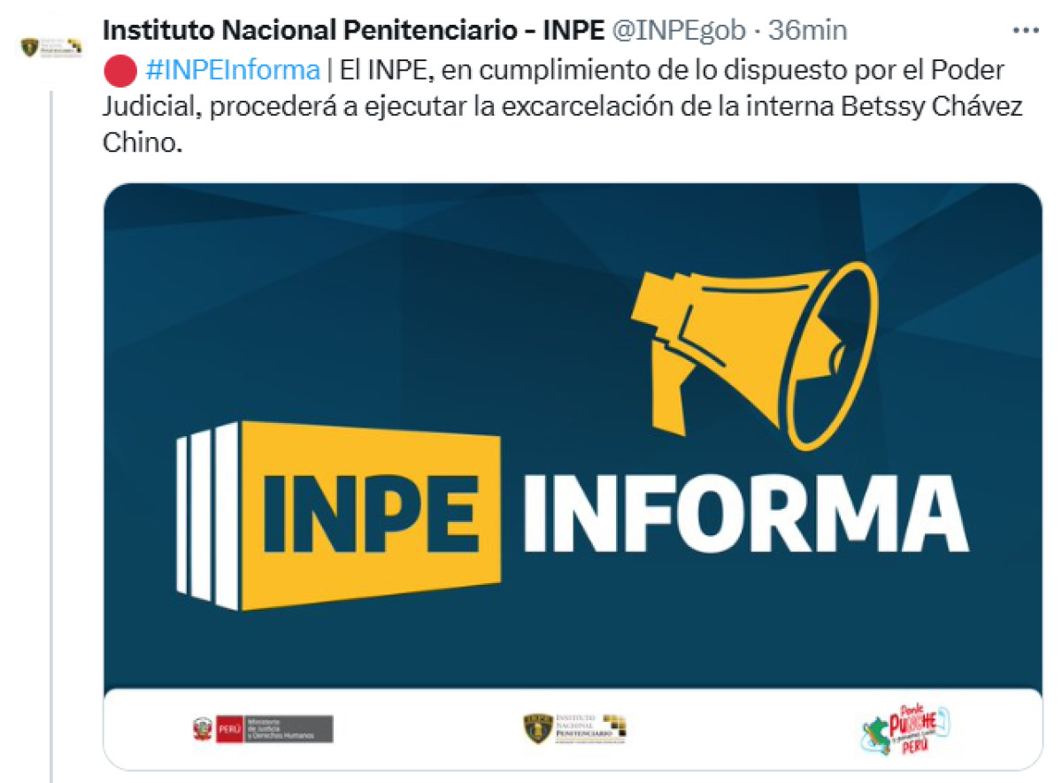 El INPE, en cumplimiento de lo dispuesto por el Poder Judicial, procederá a ejecutar la excarcelación de la interna Betssy Chávez Chino.