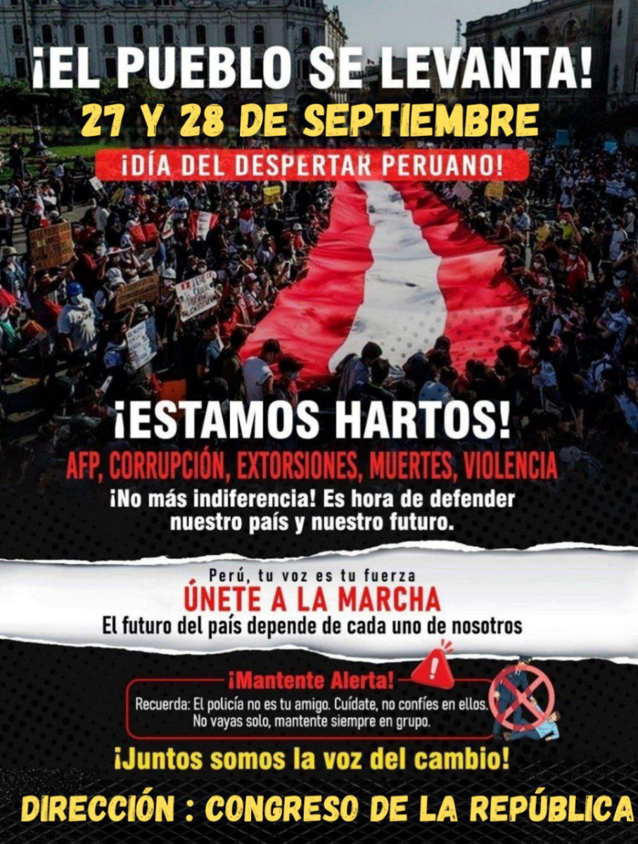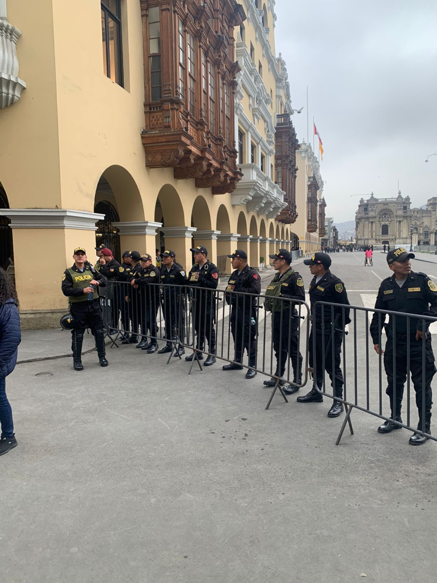 Un fuerte contingente policial acordonó los exteriores del Congreso y la Plaza de Armas para evitar el posible ingreso de los manifestantes. Esta situación ocurre a poco de iniciarse la convocatoria de la marcha para este sábado 27 de septiembre que iniciará en la Plaza San Martín.